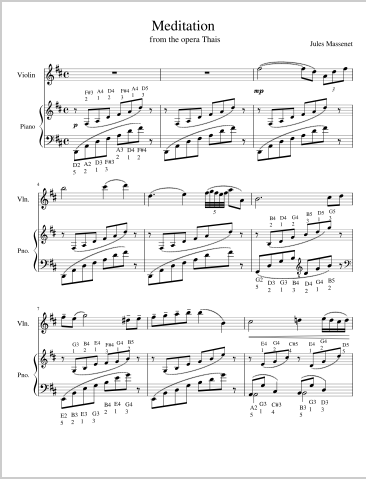 Sheet music for simplified verson of hte Meditation for piano and violin.