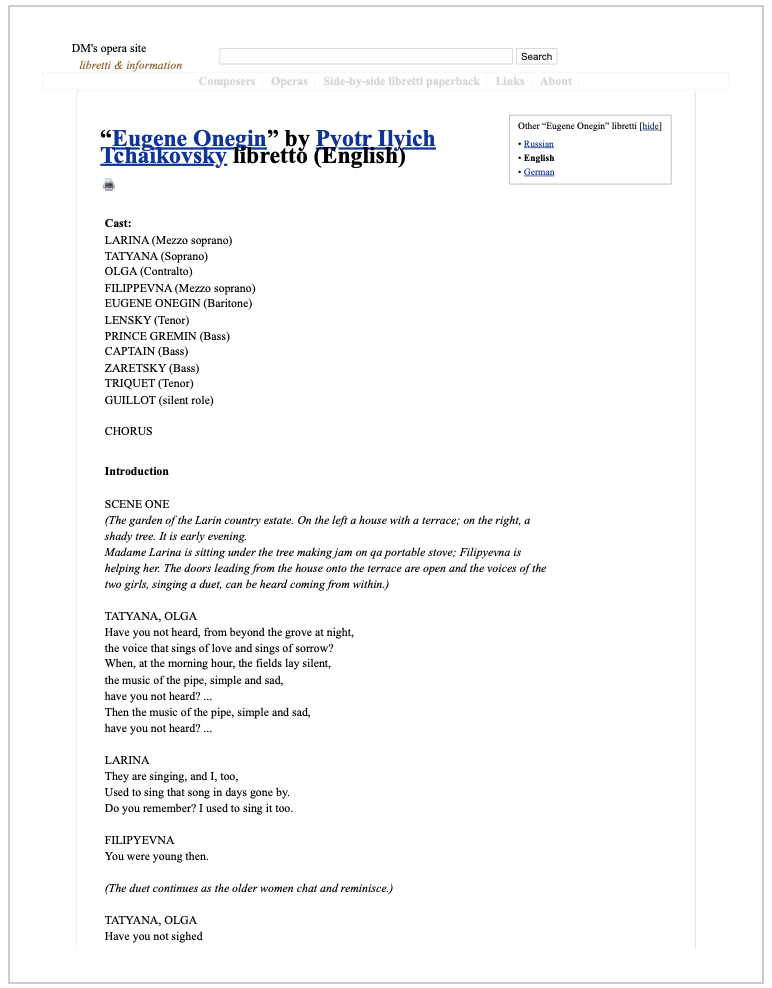 Libretto for Eugene Onegin in English translation. This is the intermediate solution to knowing the story. The synopsis in the program (above) is the quickest alternative.