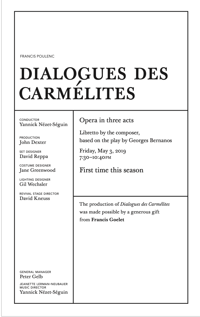 Synopsis given out at the Met for "Les Dialogues des Carmelites". Unlike a live audience member you have the time to read this in its entirety.