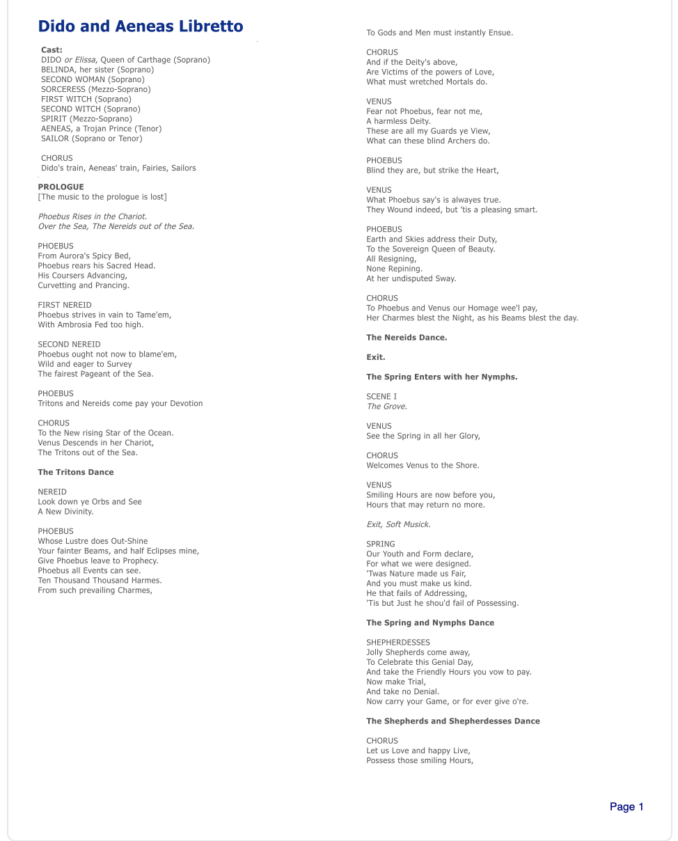 Dido and Aeneas Ballet/Oratorio
